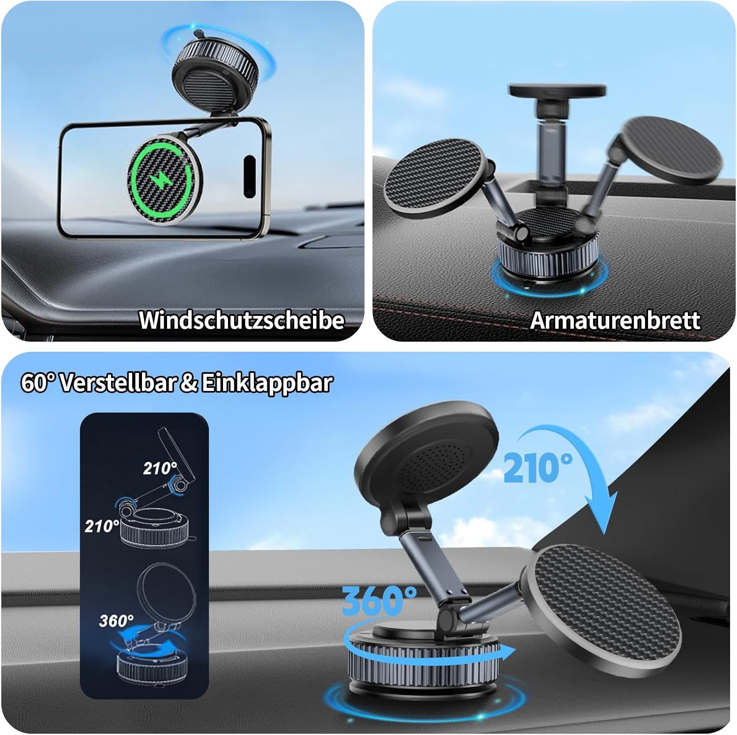 Experience the perfect combination of wireless 15W fast charging and strong magnetic hold with the Astriva Mag Safe car phone holder. Designed for Mag Safe-enabled iPhones and included metal ring for all other smartphones, this holder offers uncompromising stability – whether on the highway or in city traffic. The vacuum suction cup technology and N55 magnets secure your device even during strong vibrations, while the intelligent temperature control protects your battery. The foldable premium design made of heat-resistant ABS and carbon look blends elegantly into any vehicle interior.