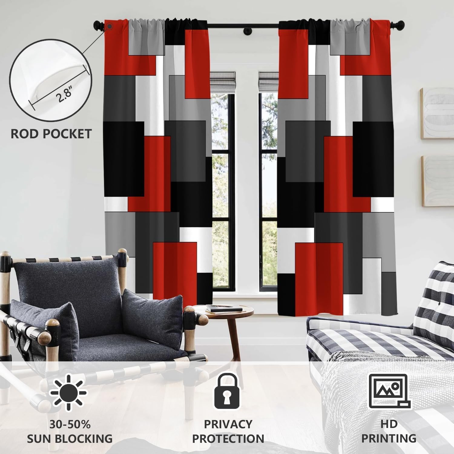AAtter Red and Black Window Curtain Grey Gray White Multicolor Geometric Silver Dark Abstract Square Art Living Room Bedroom Drapes Treatment Fabric 1 Pair Home Decor, 42″ W x 63″ L, Modern