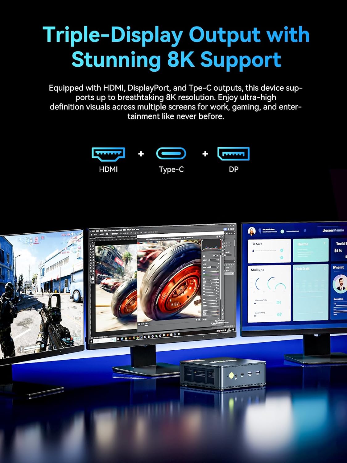 Mini Desktop Computer with 4K Triple Screen Display – Nucbox M5 Plus integrates AMD Radeon Graphics 8 Cores 2000MHz GPU to deliver powerful graphics processing power to easily handle the demands of complex design software, 4K@60Hz UHD video editing, and playback. It can connect to 3 display screens simultaneously.