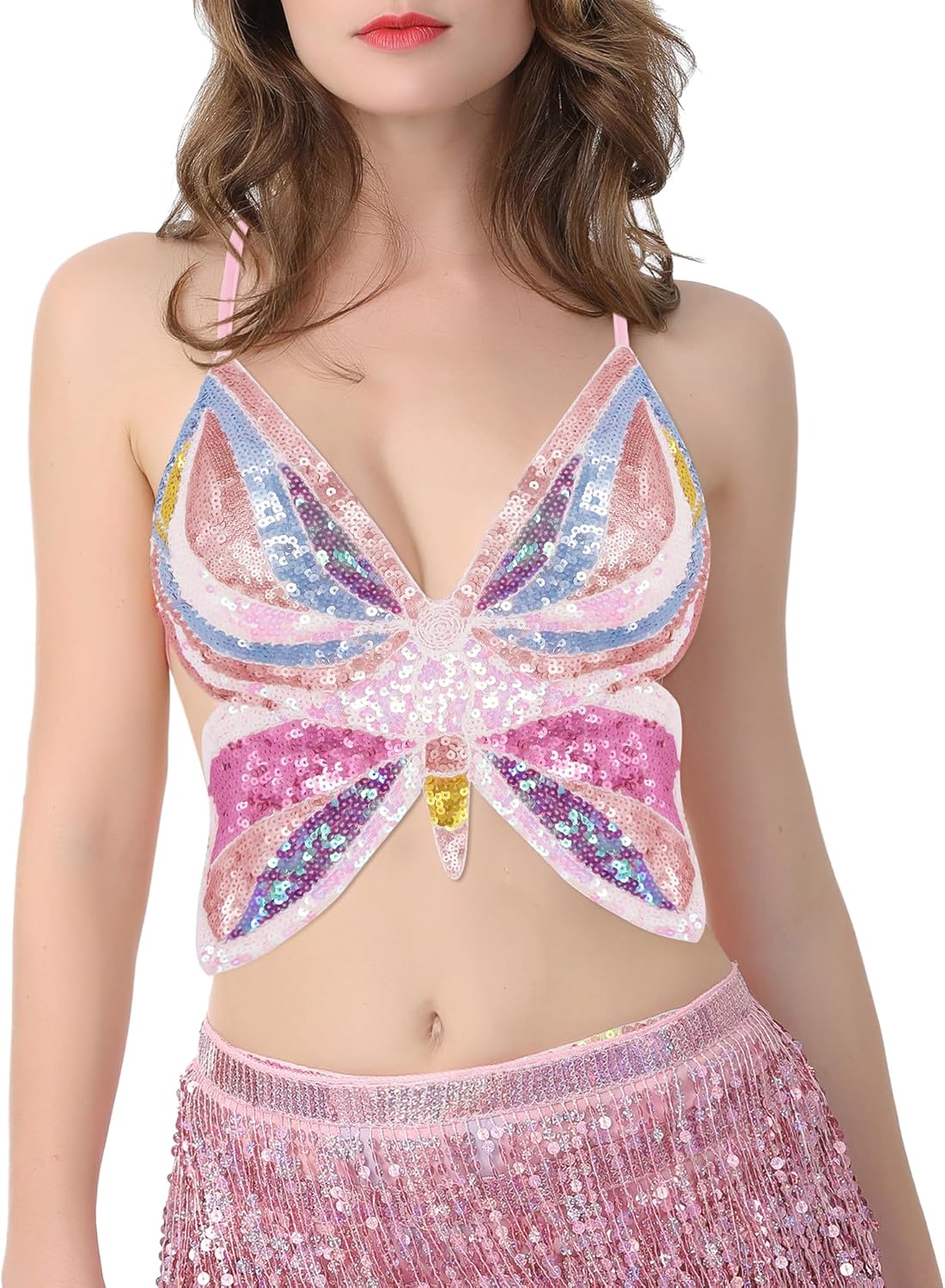 Mocure Women’s Shiny Sequin Butterfly Tank Top Low-cut Crop Top Rave Tube Vest Top for Belly Dance Costume Outfits