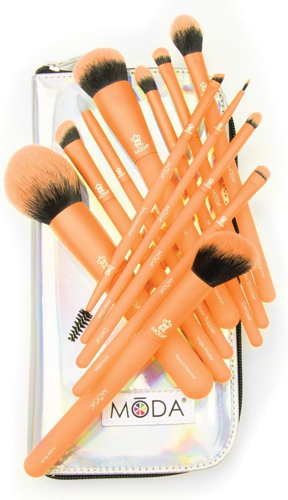 MODA Totally Electric 13pc Full Face Makeup Brush Set, Includes – Powder, Complexion, Blush, Shader, Smudger & Crease Brushes (Neon Orange)