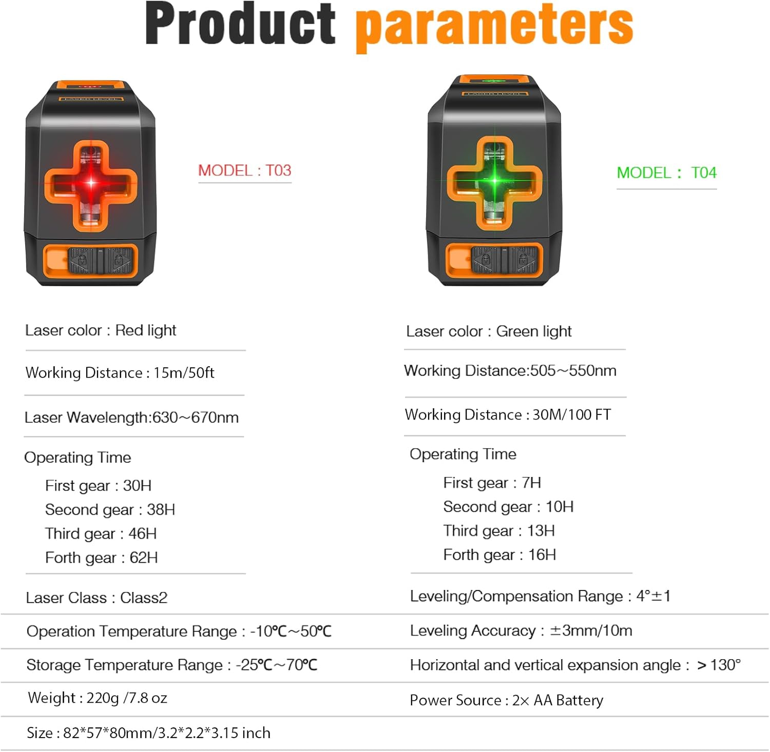 – Laser Wavelength: 630~670nm for red beam T03; 505-550nm for green beam T04;