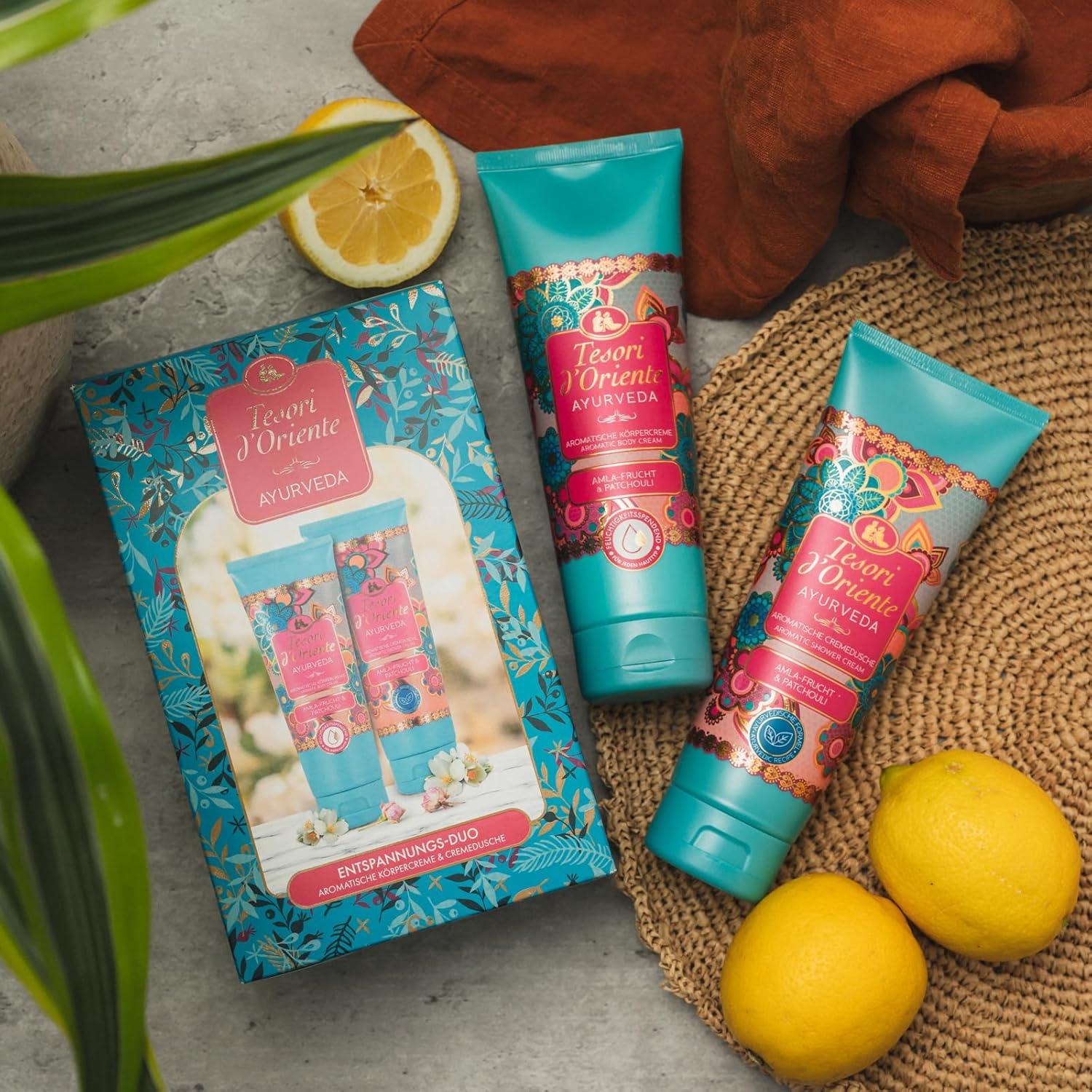 Tesori d’Oriente Gift set cream shower and body cream ‘Ayurveda’ 250 ml, aromatic body care, wellness for body and senses. Escape everyday life and embark on a journey into the magical world of the Orient. The Ayurveda body lotion and cream shower have been created in accordance with the Indian philosophy of life to restore the inner balance between body and mind. These luxurious personal care products have been specially designed to give you an intense feeling of well-being and harmony. The creamy texture is enriched with 4 valuable ingredients from the Ayurvedic tradition: amla fruit extract, sesame oil, aloe vera and calendula. These ingredients have moisturising and regenerating properties that make your skin soft, supple and radiantly beautiful. The fragrance of the body lotion and cream shower is another highlight, enriched with harmonious notes of orange, lemon and patchouli. These carefully selected aromas create a relaxing and soothing atmosphere that gives you an intense feeling of well-being and harmony. With its elegant look of the gift set and the dreamy fragrance, the two products are a great gift idea to let your loved ones travel to the Orient. Tesori d’Oriente. Wellness rituals for body & senses. The product has the following features: aromatic body cream 250 ml, aromatic shower cream 250 ml, essential and enveloping fragrance, contents: 2 x 250 ml, for a smooth and velvety skin feeling, with four traditional Ayurvedic ingredients (amla oil, sesame oil, aloe vera and calendula), suitable for all skin types. •• Made in Italy Tesori d’Oriente brings the wellness rituals of eastern and ancient worlds to the home bathroom and opens magical breaks for every day. Whether cream showers and baths, liquid soaps, fragrances, body or hand creams, the rich formulas pamper the skin and ensure a harmony of body and mind with harmonious fragrance compositions. The different lines invite you to discover new places and fragrances and immerse yourself in the fabulous world of the Orient.