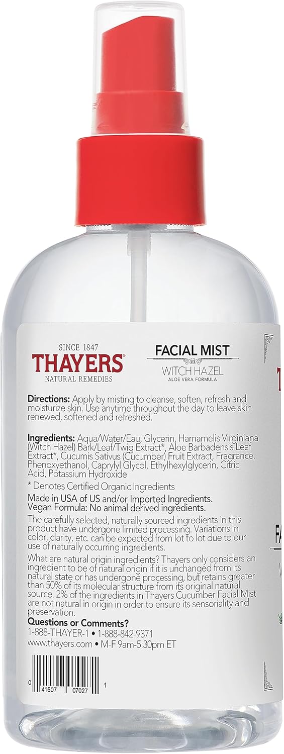 Thayers Alcohol-Free Witch Hazel Facial Mist Toner with Aloe Vera, Cucumber, Soothing and Hydrating, For All Skin Types, 8 oz