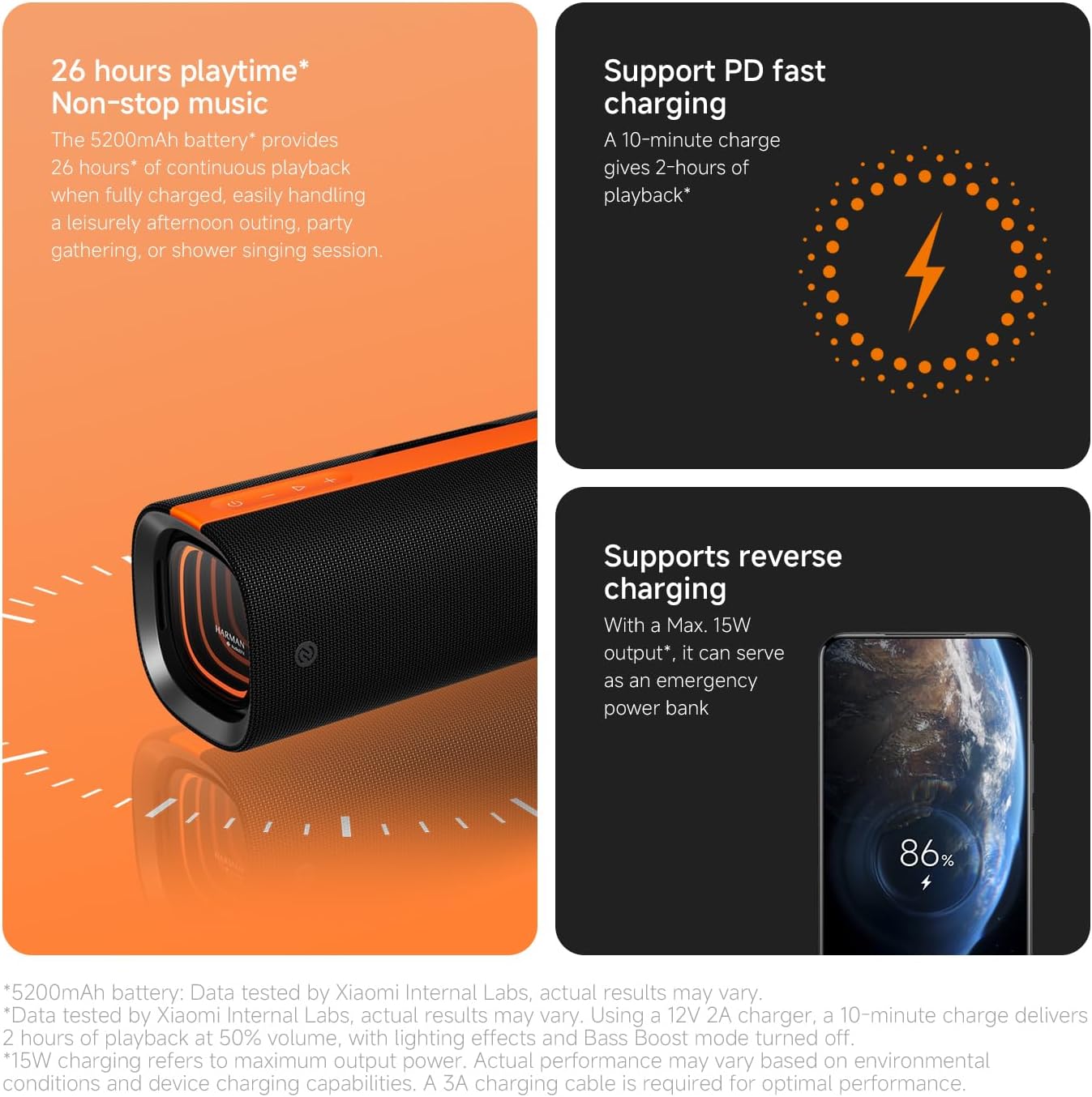 【Long Playback and Charging Function】5200mAh battery provides up to 26 hours of continuous playback. 10 minutes of charging for 2 hours of playback, and the maximum 15W output can also be used as a power bank