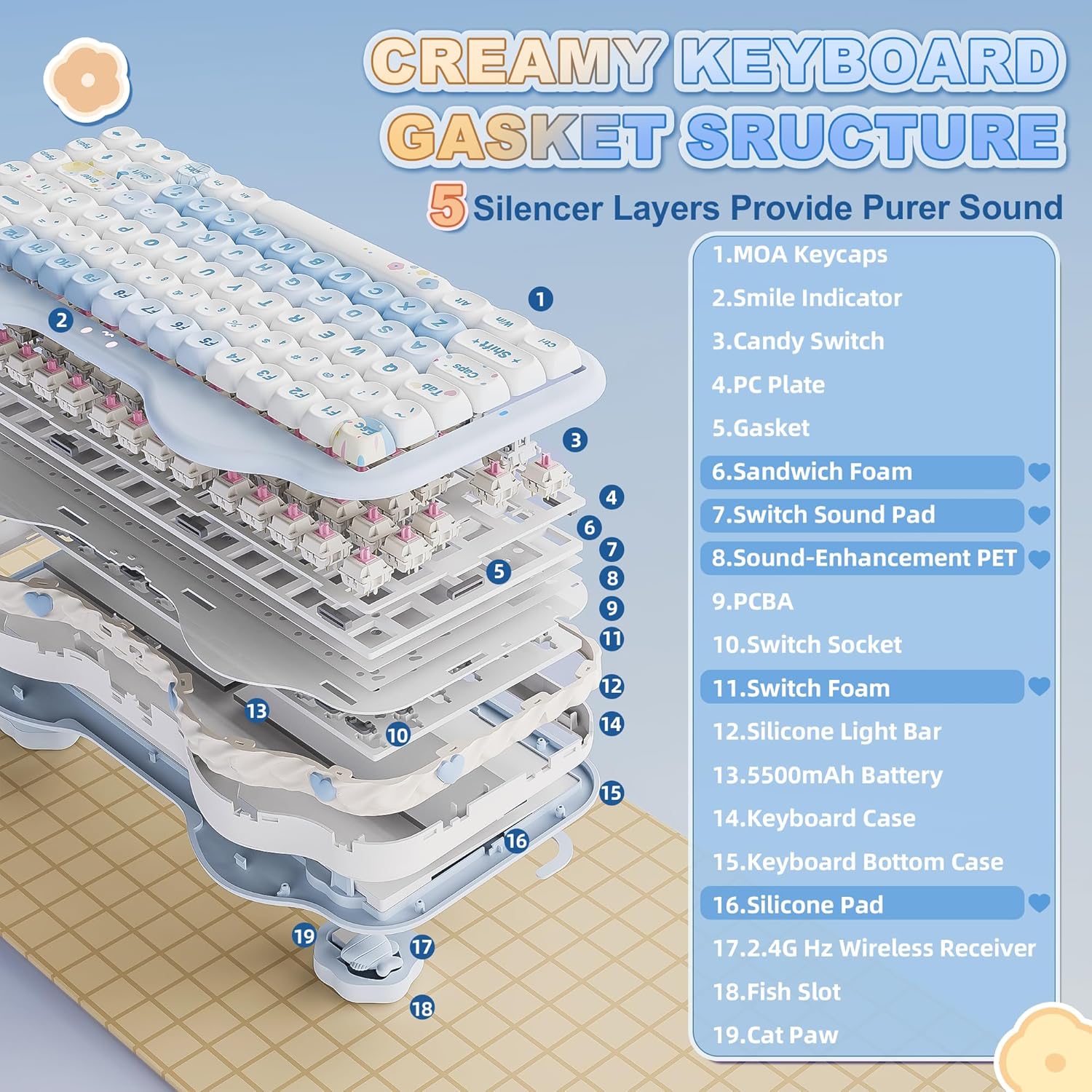 Creamy keyboard with sealing structure: this cute mechanical gaming keyboard features a sealing structure and multiple layers of sound-absorbing fillings, pre-lubricated mechanical switches, stabilisers and solid silicone that eliminate typing noise and create a solid, creamy mechanical keyboard. Enjoy gentle and even keystrokes with a pleasantly creamy sound of the Hocky keyboard that increases your typing comfort