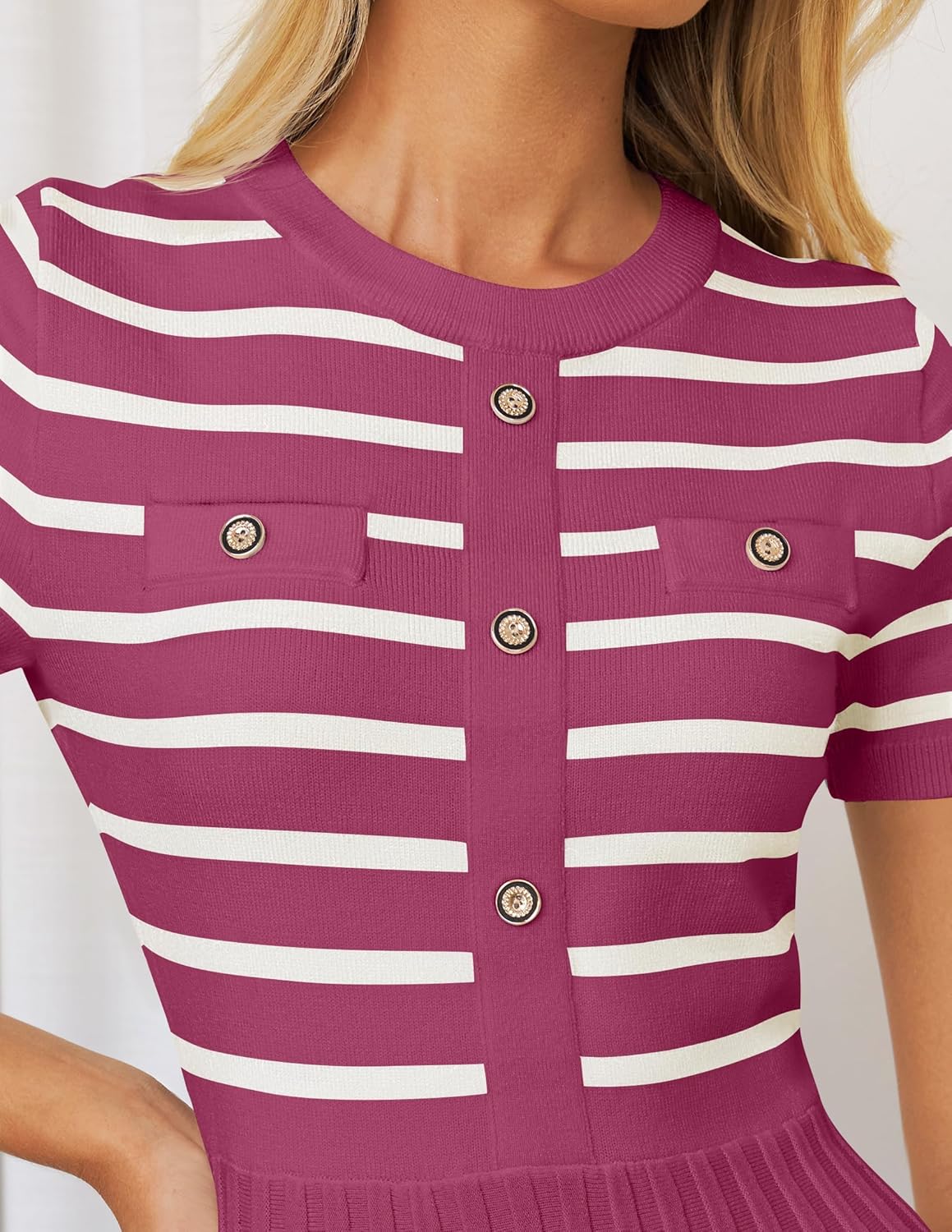 ZESICA Women’s Casual Striped Midi Dress Crewneck Short Sleeve Button Ribbed Knit Swing Pleated A Line Dresses